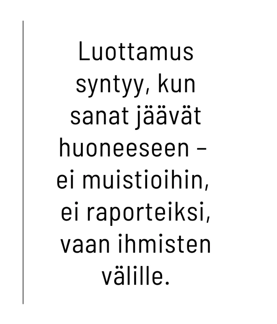 - Sopimuksissa ja käytännöissä – selkeys hinnoissa, aikatauluissa ja prosessin rakenteessa luo turvaa ja vähentää väärinkäsityksiä.
