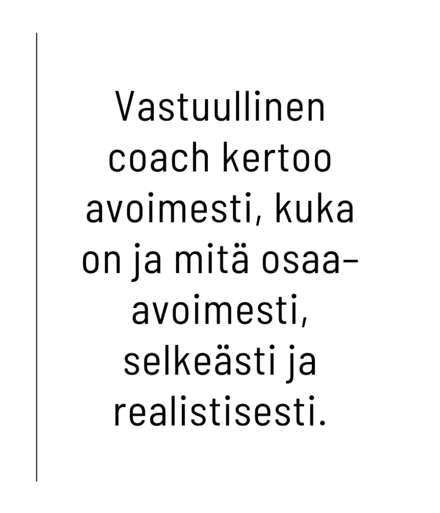 - Coach kertoo totuudenmukaisesti taustastaan, osaamisestaan ja kokemuksestaan.